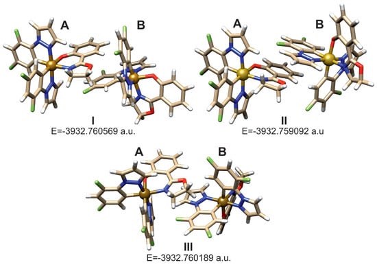 The geometry of the three dimers of complex 1 were optimized, and their equilibrium structures are shown in Figure 6. A structural model was adopted in which the oz ligand from one molecule interacted through intermolecular forces with the dfpp ligand from the other, owing to which one oz ligand has the properties of a free molecule, and the one in which rotation takes place is under the influence of intermolecular forces. In this way, both oz ligands are in different situations, which allows the isolation of the influence of intermolecular forces on one oz ligand to not affect the other oz ligand.