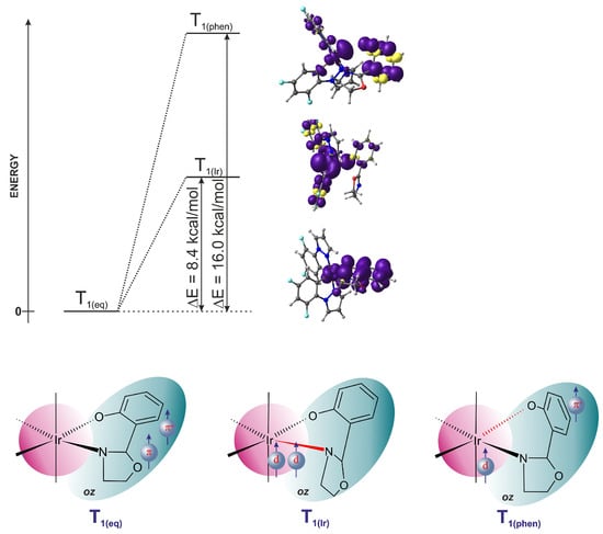 The three triplet state’s characteristics for complex 1, from the left: equilibrium geometry, state with two unpaired electrons mainly on the oxazoline fragment; state at large rotation angle of oxazoline, with two electrons predominantly on iridium; triplet state at large rotation angle of the phenolate fragment, with one electron on iridium and the second one on phenolate.