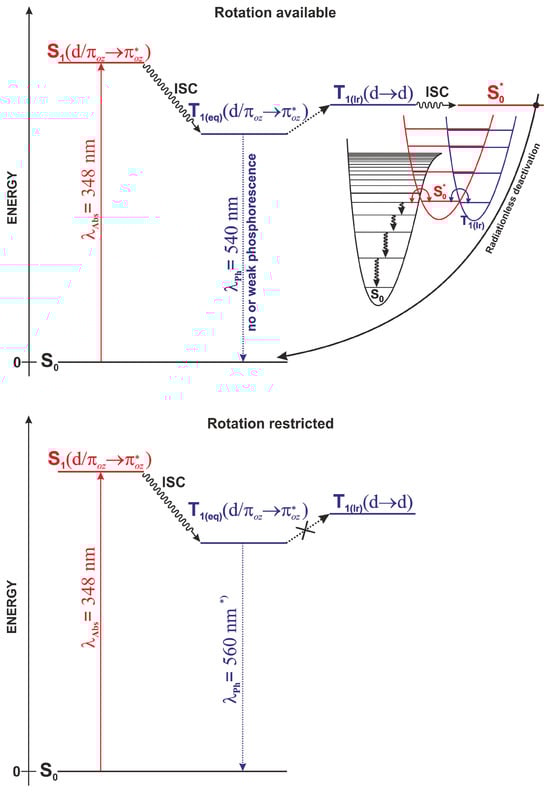 Figure 9 shows a schematic diagram of the AIE mechanism in complex 1, derived from the calculation results. After absorbing light of wavelength in the range of about 370 nm (calculated value 348 nm), the S1 state with a characteristic can be populated directly or from a higher excited state via sequential IC processes. As a result of the ISC process, the S1 state undergoes conversion to a T1 triplet state with a similar characteristic. After geometry relaxation, the T1(eq) triplet is in the emissive state, from which the phosphorescence process can take place. However, the experiment data show that complex 1 in solution exhibits virtually no emission; therefore, a radiation-free deactivation path must be available. In the presented mechanism, the deactivation path is associated with the interaction between two triplet states , as shown in the top panel in Figure 9. Such a process requires a deformation of the equilibrium geometry of the complex in the ligand region and/or within the coordination sphere. As previously noted, in the Ir complex, none of the ligands have substituents capable of free rotation; hence, we investigated the geometry deformation related to the intramolecular rotation of groups in the oz ligand around the C-C bond between the oxazoline (ox) and phenolate (phen) fragments. During rotation in the excited T1(eq) triplet state of type, at initial small values of the rotation angle, both fragments of the oz ligand most probably perform rotations up to 30–40° (Figure 4 and Figure 5). At larger rotation angles, it is energetically more favorable to twist the oxazoline fragment and, in effect, to detach nitrogen from the central atom, which leads to a change in the triplet state characteristic to the T1(Ir) type. The determined energy barrier for the transition between T1(eq) and T1(Ir) states is less than 8.5 kcal/mol. The T1(Ir) triplet state is energetically near degenerate, with the singlet state in a twisted oz ligand geometry. Taking into account that the triplet and singlet are close in energy, the T1(eq) ⇝ intersystem crossing should be effective, which means that the triplet state is quenched nonradiatively, and the system relaxes to the energy minimum of the S0 ground state and the equilibrium geometry of the complex (right-hand side of the panel in Figure 9). The second factor that causes the effectiveness of ISC is the fact that for large dihedral angles , the potential energy curves of both states are almost parallel. This local surface topology suggests that around the PES intersection region, the difference in energy gradients of the interacting electronic states is small. This property, according to Landau–Zener theory [49], efficiently increases the probability of intersystem crossing.