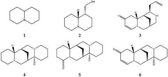 - Boschin, G.; Resta, D. Alkaloids Derived from Lysine: Quinolizidine (a Focus on Lupin Alkaloids). In Natural Products; Ramawat, K.G., Mérillon, J.-M., Eds.; Springer: Berlin/Heidelberg, Germany, 2013; pp. 381–403. ISBN 978-3-642-22143-9. [Google Scholar]