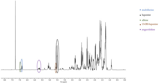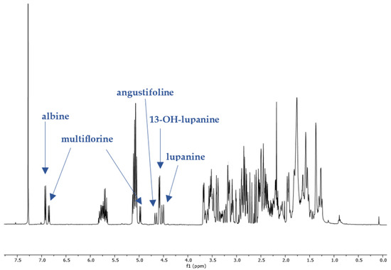 1H-NMR spectrum (400 MHz, CDCl3, δ-values in ppm) from a fraction of an extract of L. albus obtained during column chromatography, showing the characteristic peaks of five studied QAs. Line arrows indicate the corresponding peaks used for quantitation of albine, multiflorine, angustifoline, 13-OH-lupanine and lupanine (peak heights are not representative of the concentrations in the original plant extract).