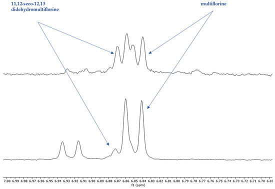The quantitation was based on the integration ratio between the proton signal of syringaldehyde at 9.81 ppm and the protons of each studied substance as shown in Table 1 and Figure 2. Non overlapping, undoubtedly defined peaks of protons were selected for quantitation. It should be noted that multiflorine was identified by integrating the one scale of the doublet peak of the proton at 6.84 ppm, while 11,12-seco-12,13-didehydromultiflorine by integrating the one scale of the double doublet peak of the proton at 6.87 ppm.