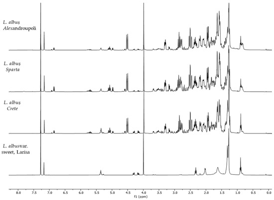 1H-NMR spectra (400 MHz, CDCl3, δ-values in ppm) from L. albus spp. originating from Crete, Alexandroupoli, Sparta and the sweet variety from Larisa.