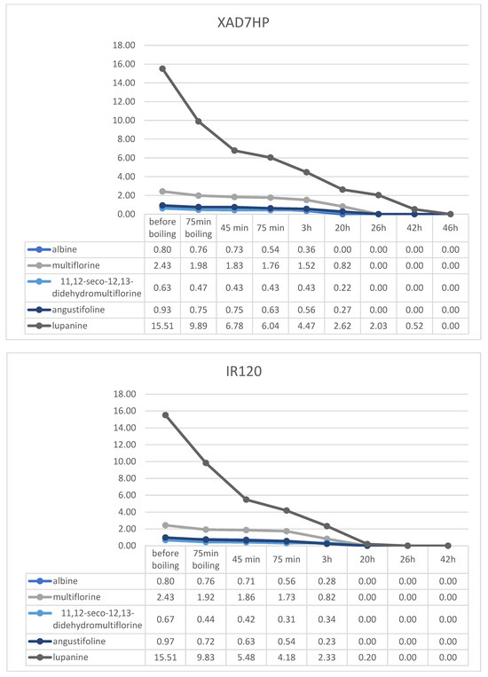 The resin which showed the highest retainment of alkaloids was the ion exchange resin IR120, since almost all alkaloids were eliminated after 20 h, except for 0.2 mg/g lupanine. Also, ion exchange C100E, which is suitable for food processing, presented strong retention, with alkaloids elimination being achieved in 26 h. Finally, in the case of the adsorptive non-ionic XAD7HP, after treatment for 42 h, only 0.5 mg/g lupanine remained in the seeds.