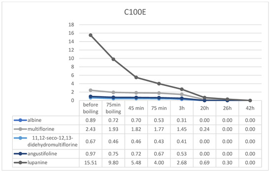 1H-NMR quantitation of alkaloids in lupine seeds during the resin debittering process was performed following the same quantitation protocol that was developed for the unprocessed seeds. Samples of lupins were quantified before the beginning of the debittering process, after boiling, after 45, 75 min, 3, 20, 26, 42 and 46 h of debittering. Diagrams showing the removal rate of alkaloids in each resin as well as the concentration of them are presented in Figure 6. Results are presented in mg/g DM.