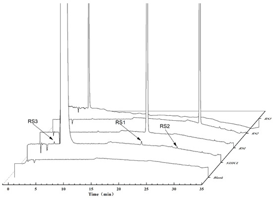 The respective thresholds used for LOD and LOQ determinations were signal-to-noise ratios of 3:1 and 10:1. The RSD of the areas for six replicate injections at the LOQ concentration was <10% and the respective signal-to-noise ratios at the LOD and LOQ concentrations were less than three and ten. Respective measured LOD values for RS1, RS2, and RS3 were 0.103, 0.0823, and 0.0854 µg/mL, with corresponding LOQ values of 0.309, 0.248, and 0.256 µg/mL. The LOD and LOQ for STHCl were 0.0625 and 0.1875 µg/mL, respectively. The resultant data are presented in Table 3.