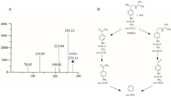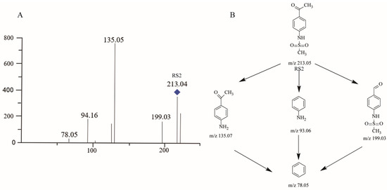 A process-related impurity detected at RT 26.8 min was designated as RS2 and the mass spectrum for RS2 exhibited a protonated molecular ion at m/z 213.05 (Figure 4A and Figure S5.3). RS2 was the major degradation product generated under thermal stress conditions which resulted in a 5.7-fold increase in RS2 levels. HPLC and LC–MS results suggested that STHCl was degraded into the m/z 135.05, 94.16, and 78.05 product ions, two of which were the same as those observed for RS1. These product ions may be formed by the mechanisms outlined in Figure 4B. RS2 was further characterized by 1H-NMR and 13C-NMR approaches (Figures S5.1 and S5.2). RS2 was isolated as an amorphous white powder with a quasi-molecular ion [M + H]+ at m/z 212.0386 (calculated for C9H11NO3S, 212.0387) in its HRESIMS spectrum, with seven magnitudes of unsaturation. Its 1H-NMR spectrum included two methyl signals [δH 2.57 (H3-8), 3.06 {H3-[S(=O)2−]}], one amine (NH) liable proton [δH 4.59 (H-N)], and two OPS at δH 7.32 (H-2, 6) and 8.00 (H-3, 5). Its 13C-NMR spectrum exhibited seven carbon resonances that were categorized as two carbonyl resonances at δC 199.4 (C-7), olefinic bonds at δC 144.7 (C-4), 133.6 (C-2,6), 131.3 (C-1), and 119.0 (C-3, 5), and two methyl resonances at δC39.9 (Me-[S(=O)2−]) and 19.3 (C-8). These spectroscopic data led to the identification of RS2 as N-(4-Acetylphenyl) methanesulfonamide [22].