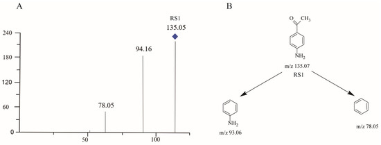 Mass chromatogram and potential fragmentation schemes for RS1. (A) Ionic peaks of RS1-related products. (B) Possible dissociation mechanisms for the formation of RS1 product ions.