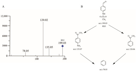 Mass chromatogram and potential fragmentation schemes for RS2. (A) Ionic peaks of RS2-related products. (B) Possible dissociation mechanisms for the formation of RS2 product ions.
