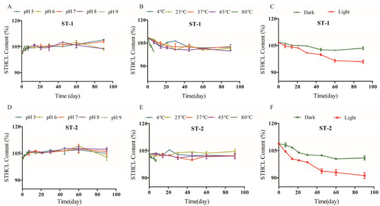 Two batches of STHCl API (nos. ST-1 and ST-2) content under different conditions. (A) shows the storage content of ST-1 at different pH; (B) shows the storage content of ST-1 at different temperatures; and (C) shows the storage content of ST-1 under light. (D–F) show the storage content of ST-2 at different pH, temperature, and light.