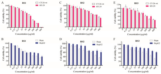 In vitro analyses were next used to better understand the toxicological and biological characteristics of RS1 and RS2. The cytotoxicity of these two RSs was assessed by using them to treat the CT26.WT, HT-29, HepG-2, and HePa 1-6 cancer cell lines (Figure 7, Table 10), with DMSO as a control [24]. The respective IC50 values for RS1 when used to treat CT26.WT and HT-29 cells were 47.44 and 64.81 μg/mL.