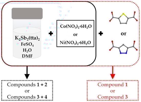 Figure 1 illustrates the synthesis methods for compounds 1, 2, 3 and 4. When only Co(NO3)2·6H2O or Ni(NO3)2·6H2O is added to the reaction vessel, compounds 1 and 2 or 3 and 4 can be obtained together. However, when 0.05 g of thiophene-2,5-dicarboxylic acid or pyrazole-3,5-dicarboxylic acid was added with Co(NO3)2·6H2O or Ni(NO3)2·6H2O at the same time as the starting materials of two syntheses, it was found that compound 2 as well as compound 4 could not be obtained, and only a small amount of compounds 1 and 3 could be obtained, respectively, and the quality of the crystals deteriorated compared to that from the original reaction. But when the reaction solvents were changed from 3 mL H2O as well as 1 mL DMF to 4 mL H2O, all of the above-mentioned crystals could not be obtained. In summary, we speculate that compounds 2 and 4 are synthesized under sensitive conditions and that minor pH changes may affect their synthesis [14].