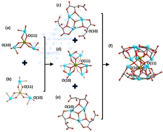 To date, potassium antimony tartrate has been extensively combined with transition metal ions to form a range of transition-metal-antimony-oxo tartrate cluster-based structures with different structural types. In term of properties, however, mostly only the magnetic behavior has been investigated as shown in Table S1 [13,14,15,16,17,18,19,20,21]. From the structure point of view, the clusters adopt either sandwich or bowl configurations. The sandwich configuration is dominant, and it can be further subdivided into bilayer sandwiches and monolayer sandwiches depending on the intermediate layer. In bilayer-sandwiched compounds, the intermediate portion is occupied by the {MSb3}2 (M = Co, Ni, Cu, Ni or Cr) layer (e.g., in Na4[Cu2Sb12(µ3-O)6(µ3-OH)2(µ4-O)3(tta)6]·19H2O) [14,16,18]. By contrast, the intermediate layer of monolayer ones is generally occupied by {MO6M’3M’’n} (M = V, Mn, Fe, Cu, Sb(V); M’ = Mn, Fe, Co, Cu; M’’ = Mn, Fe, Co, Cu, Cd), where M is the center metal ion, M’ are the three metal ions surrounding M and M’’ are the peripheral metal ions [13,14,15,16,17,19,20,21]. Notably, the vast majority of the center metal ions M are a transition metal ion (e.g., in (H4TPOM)[FeIII4Mn3Sb6(μ4-O)6(μ3-O)2(L-tta)6(H2O)]·16H2O, TPOM = tetrakis(4-pyridyl-oxymethylene)-methane) [17], while it is rarely occupied by Sb(V) (e.g., in H5{ACd(H2O)6[A(H2O)3Co3SbVSbIII6(μ3-O)8(L-tta)6]}·7H2O (A = Cd0.5 + Co0.5)) [19,21]. However, the transformation process of the center metal from transition metal ions to Sb(V) ions is still ambiguous. Therefore, it is interesting and meaningful to explore the transformation process of the central metal in the monolayer sandwich-typed transition-metal-antimony-oxo tartrate clusters which may provide a hint to design new transition-metal-antimony-oxo clusters of this type.