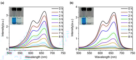 Liquid UV-visible absorption spectra of methylene blue (MB) solution containing compounds 2 (a) and 4 (b) over the varying illumination time. The initial concentration of MB solution was 30 ppm and the test temperature was 25 °C. The insets in (a,b) are the photos of MB solution photodegraded with compounds 2 and 4 for 8 h.