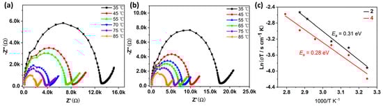 Nyquist plots from AC impedance data of 2 (a) and 4 (b) at 98% RH and varied temperatures between 35 and 85 °C. (c) Arrhenius plots of proton conductivity of compounds 2 and 4 at different temperatures under 98% RH.