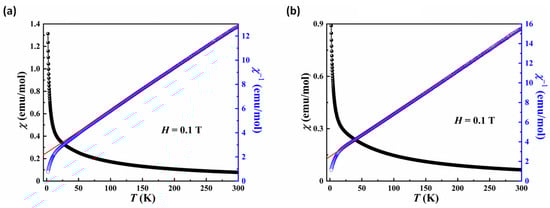 Plots of the χ and χ−1 versus T for compounds 2 (a) and 4 (b) in the 2~300 K temperature range in an applied field of H = 0.1 T. The red line indicates Curie-Weiss fitting.