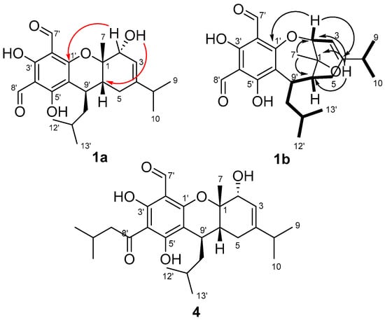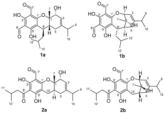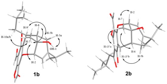 The relative configurations of the revised planar structures 1b and 2b were determined via thorough re-examination of the ROESY NMR spectra for eucalyprobusal C and NOESY NMR spectra for eucalypcamal K, provided in their respective supplementary information [30,31]. Key ROESY correlations from 1-OH to H-5a, as well as from methyl protons H-7 to methylene protons H-10′ and methine H-2, were consistent with *S relative configurations at stereocenters C-2, C-6, and C-7 in 1b (Figure 4). Further, the methine proton H-9′ shared a ROESY correlation with the methylene proton H-5b, suggesting that C-9′ also shared *S relative configuration.
