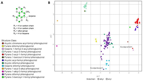 (A): NMR chemical shifts analyzed via PCA (green = carbon and hydrogen chemical shifts analyzed). (B): PCA analysis of 1H and 13C NMR data for formyl phloroglucinols (n = 179) color coded by sub-structure class. The published structures for eucalyprobusal C and eucalypcamal K (1a and 2a, annotated) do not cluster with other members of their assigned formyl phloroglucinol class, indicative of their structural misassignments.