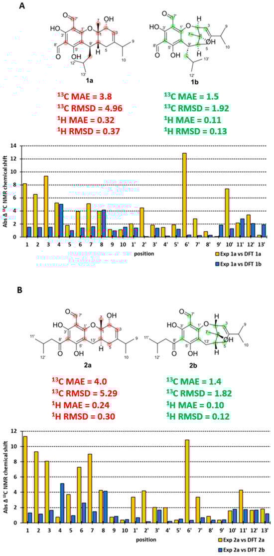 (A): 13C NMR experimental and DFT-calculated data absolute error (incorrect 1a = yellow and revised 1b = blue) for eucalyprobusal C. (B): 13C NMR experimental and DFT-calculated data absolute error (incorrect 2a = yellow and revised 2b = blue) for eucalypcamal K.