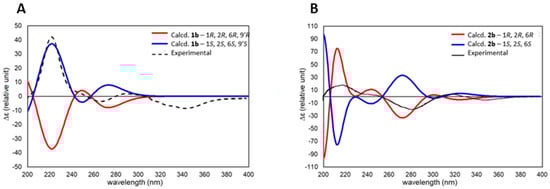 (A): TDDFT-calculated ECD spectra for eucalyprobusal C (1b—1S, 2S, 6S, and 9′S) overlayed with experimental ECD spectra reported for eucalyprobusal C. (B): TDDFT-calculated ECD spectra for eucalypcamal K (2b—1R, 2R, and 6R) overlayed with experimental ECD spectra reported for eucalypcamal K.