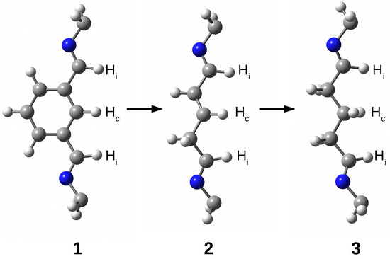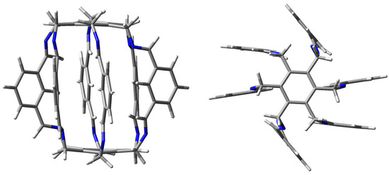Geometry optimizations of the superphanes 1 (see Figure 2), 2 and 3 (see Figure 5) and their carceplexes with O, N, HF, HCN, or MeOH were performed at the B97X-D/6-31G(d) level of theory, i.e., within the B97X-D exchange-correlation functional [33] of Density Functional Theory [34,35] and the 6-31G(d) basis set [36,37]. As shown [38], within the group of the 200 tested exchange-correlation functionals, B97X-D proved to be one of the best for general purposes, including the reliable description of intermolecular interactions. Moreover, as shown earlier [9], this functional well reproduced the crystallographic structure of [26]superphane. Frequency analysis were performed to confirm true minima on the potential energy surface. In each case, all frequencies were positive, confirming that stable forms were always obtained. It should be noted that the multiplicity of binding sites in the side chains of the tested superphanes may lead to many minima on the potential energy surface, i.e., to various forms of the obtained carceplexes. Therefore, geometry optimizations have started with several different initial geometries, which in some cases have led to different final carceplex geometries, although in some cases only one such complex has been obtained. For convenience, the obtained guest@superphane carceplexes have been marked as ijk, where i denotes the superphane molecule (i.e., 1, 2, or 3; see Figure 2 and Figure 5), j numbers the guest molecule, 1 for O, 2 for N, 3 for HF, 4 for HCN, and 5 for MeOH, while k, being a, b, or possibly c, refers to the corresponding forms of carceplex ij in order from the most stable to the least stable.