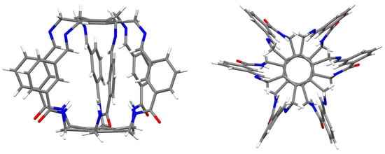Shortly thereafter, the same group in a series of papers showed the possibility of trapping small molecules and anions by various similar superphanes [21,22,23,24]. The trapped species included (2H2O) and MeOH [21], , DMSO, and (H2O·MeOH) [22], H2 and [23], or and [24]. The trapped species interact with many binding sites of a given superphane through hydrogen bonds. As has often been emphasized [20,21,22,23,24], the obtained superphanes are characterized by extremely high selectivity towards trapped species over many other types of competing ions, and the obtained carceplexes show high thermal stability in a wide range of pH. Therefore, the obtained superphanes may be extremely important, e.g., in the removal of toxic ions (such as ) from wastewater. Similar superphanes were also obtained by the group of Jovica D. Badjić [25,26]. Similarly, this group explored the possibility of selectively trapping a wide variety of ions [26], showing that the barrel-shaped hexapodal superphane they obtained (see Figure 3) easily binds tetrahedral oxyanions, such as or [25]. High selectivity and different ion trapping times result from the specific slotted structure of the side surface of the superphane. It is also noted that the accommodation of the trapped ion is facilitated by the adaptation of the appropriate conformation of the trapping superphane host molecule.