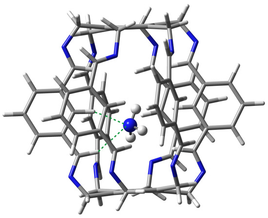 Carceplex @1 is the only one for which only one form was obtained (Figure 8). The interaction between and 1 is weaker (−12.9 kcal/mol) than the previously discussed O in O@1. The interaction is mainly dominated by C-N hydrogen bonds (BE of the strongest of them is −3.4 kcal/mol) and, to a much lesser extent, C-N (−1.8 kcal/mol). According to QTAIM, the trapped ammonia molecule interacts with the superphane 1 also through its N-H bonds, forming two N⋯H-N hydrogen bonds (BE are −0.6 and −1.4 kcal/mol) and two weak C-H-N contacts (−0.2 and −1.1 kcal/mol). Despite the relative weakness of the interactions (perhaps except one C-N hydrogen bond), their large number (10) makes the ∑BE value relatively large at −9.9 kcal/mol.