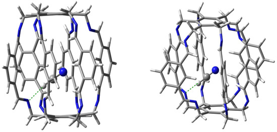 Structures of carceplexes 14a (left) and 14b (right). The dominant N⋯H-C hydrogen bonds are marked with a green dashed line.