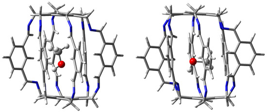 The HCN molecule can be both a proton donor and a proton acceptor, so it was interesting to see its main sites of interaction after trapping. Geometry optimizations led to two forms of the HCN@1 carceplex with equal binding energies (−16.2 kcal/mol) and very similar arrangements of the HCN molecule (Figure 10).