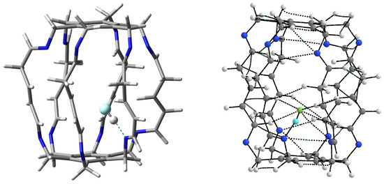 Similarly to carceplexes 13a and 13b, the stabilization of the system is dominated by the N⋯H-F hydrogen bond, but in the case of carceplex 23, this bond is much stronger. According to Equation (2), its energy is −12.1 kcal/mol, while −10.8 and −9.5 kcal/mol in 13a and 13b, respectively. The exceptional strength of this bond is also reflected in its extremely short length, which is only 1.657 Å. QTAIM calculations suggest, however, that such a high stabilization of carceplex 23 is also due to the significant participation of three relatively strong C-H⋯F hydrogen bonds, two involving the central H atoms (−2.7 and −2.0 kcal/mol) and one involving hydrogen from the imino group (−1.6 kcal/mol). The remaining interactions visible in Figure 12 are not significant (−0.8 kcal/mol for the third hydrogen bond C-F, −0.2 kcal/mol for the second hydrogen bond C-F, and −0.6 kcal/mol for the contact N⋯F). The total binding energy for all HF⋯2 interactions visible in Figure 12 is −20.1 kcal/mol, which is greater than −16.4 and −14.7 kcal/mol for 13a and 13b, respectively (Table 1).