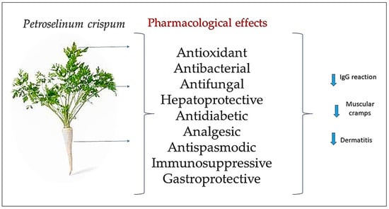 APA StyleGanea, M., Vicaș, L. G., Gligor, O., Sarac, I., Onisan, E., Nagy, C., Moisa, C., & Ghitea, T. C. (2024). Exploring the Therapeutic Efficacy of Parsley (Petroselinum crispum Mill.) as a Functional Food: Implications in Immunological Tolerability, Reduction of Muscle Cramps, and Treatment of Dermatitis. Molecules, 29(3), 608. https://doi.org/10.3390/molecules29030608