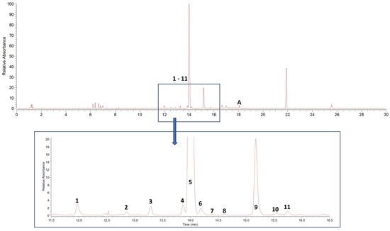 DAD-UV chromatogram (spectrum maximum plot 190–700 nm) of Acmella oleracea flower heads dichloromethane extract. 1–11 characterized alkylamides, A additionally isolated ketoester (acmellonate).