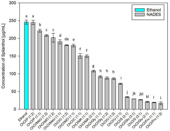 Concentration of spilanthol in extracts prepared with NADES and ethanol; data are given as means ± SD and different letters indicate significant differences between extracts (p < 0.05).