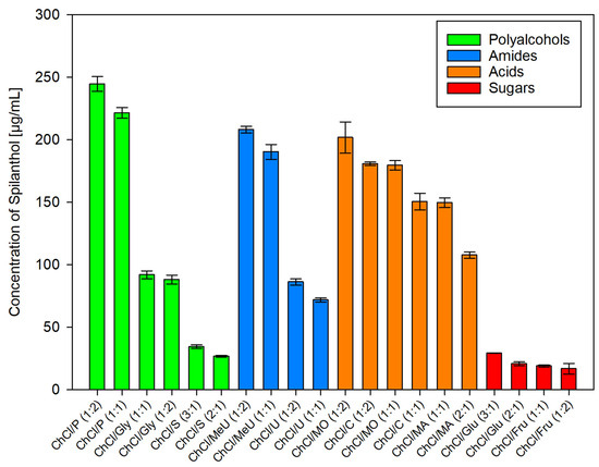 After employing dichloromethane extraction for qualitative analysis and isolation of main compounds in Acmella oleracea flower heads, green chemistry alternatives for the extraction of spilanthol were investigated. For this, 20 different NADES preparations and ethanol as reference for a classic green organic solvent, were used as extraction agents. In NADES, choline chloride (ChCl), which was granted GRAS status (generally recognized as safe) by the United States Food and Drug Administration (FDA) [38], was chosen as a non-toxic hydrogen bond acceptor (HBA) in all cases. Hydrogen bond donors (HBD) can be separated into two amides (methylurea MeU, urea U), three polyalcohols (1,2-propanediol P, glycerol Gly, sorbitol S), three organic acids (malonic acid MO, citric acid C, malic acid MA) and two sugars (glucose Glu, fructose Fru). All NADES preparations remained stable for several weeks, consisted of components widely considered non-toxic for humans and were tested in different molar ratios of HBA and HBD, given in parentheses, with 20% m/m water addition. Figure 3 shows results for all investigated solvents in µg of spilanthol per ml of extraction agent. Figure 4 gives results grouped by HBD type used in NADES.