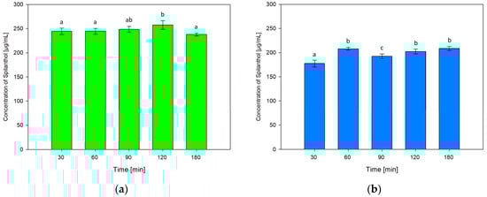 Concentration of spilanthol in NADES extracts with solvents ChCl/P (1:2) (a) and ChCl/MeU (1:2) (b) at various extraction times; data are given as means ± SD and different letters indicate significant differences between extraction conditions (p < 0.05).