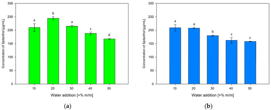 Concentration of spilanthol in NADES extracts with solvents ChCl/P (1:2) (a) and ChCl/MeU (1:2) (b) with varying water additions (+% m/m); data are given as means ± SD and different letters indicate significant differences between extraction conditions (p < 0.05).
