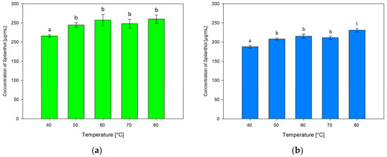 Concentration of spilanthol in NADES extracts with solvents ChCl/P (1:2) (a) and ChCl/MeU (1:2) (b) at various extraction temperatures; data are given as means ± SD and different letters indicate significant differences between extraction conditions (p < 0.05).