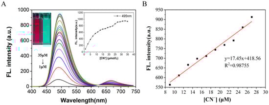 Chicago/Turabian StyleLi, Dongmei, Senlin Peng, Xu Zhou, Lingyi Shen, Xianjiong Yang, Hong Xu, Carl Redshaw, Chunlin Zhang, and Qilong Zhang. 2024. "A Coumarin–Hemicyanine Deep Red Dye with a Large Stokes Shift for the Fluorescence Detection and Naked-Eye Recognition of Cyanide" Molecules 29, no. 3: 618. https://doi.org/10.3390/molecules29030618