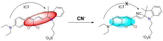 - Lv, X.; Liu, J.; Liu, Y.; Zhao, Y.; Sun, Y.Q.; Wang, P.; Guo, W. Ratiometric fluorescence detection of cyanide based on a hybrid coumarin–hemicyanine dye: The large emission shift and the high selectivity. Chem. Commun. 2011, 47, 12843–12845. [Google Scholar] [CrossRef]