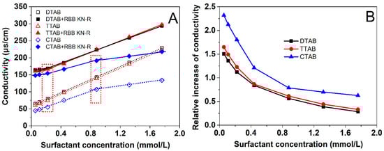 The outcomes depicted in Figure 2A illustrate a linear increase in solution conductivity for DTAB and TTAB, ranging from 0.055 mmol/L to 1.76 mmol/L, in the absence of RBB KN-R. Such an observation implies that the CMCs for both surfactants exceeded 1.76 mmol/L in the 0.2 mmol/L Na2HPO4 solution of 7.0 [26,27]. In contrast, CTAB exhibited a faster linear rise in solution conductivity between 0.055 mmol/L and 0.88 mmol/L compared to the range of 0.88 mmol/L to 1.76 mmol/L. These results suggest that the CMC of CTAB approximated 0.88 mmol/L [27]. Upon the introduction of RBB KN-R into each surfactant solution, a substantial increase in solution conductivity was observed due to the dye dissociation. Notably, the relationship between solution conductivity and surfactant concentration remained linear. The slope for the higher concentration range (>0.22 mmol/L) was identical to that observed without the presence of RBB KN-R, albeit it was greater than the slope for the lower concentration range (<0.22 mmol/L). These findings suggest that RBB KN-R interacted with each surfactant in a 1:1 molar ratio under the prevailing solution conditions [24,26].