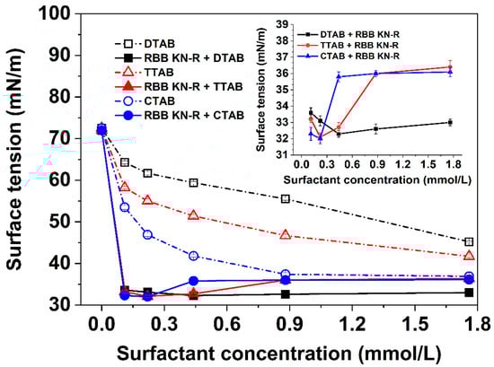 Dependencies of surface tension on DTAB, TTAB, and CTAB concentrations with and without RBB KN-R.