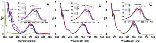 Figure 4A demonstrates that the UV-Vis spectrum of RBB KN-R exhibited two distinct adsorption peaks at 592.6 nm and 283.5 nm, corresponding to the chromophoric and aromatic groups, respectively. With the incremental addition of DTAB into the RBB KN-R solution to 0.22 mmol/L, the peak at 592.6 nm underwent a progressive blue shift, while the peak at 283.5 nm showed a red shift, accompanied by a decrease in their respective absorbance values. Simultaneously, a novel peak emerged at 633.4 nm at 0.22 mmol/L. In Figure 4B,C, similar phenomena were also observed for TTAB and CTAB in the surfactant range from 0 to 0.22 mmol/L. Based on the results in Figure 2, the RBB KN-R molecules gradually interacted with the surfactant molecules to form ion pairs at a molar ratio of 1:1 with the successive addition of surfactant up to 0.22 mmol/L. The dye–surfactant complexes had high hydrophobic properties (Figure 3), so their aggregates were readily formed via hydrophobic forces [36,37], corresponding to the appearance of peaks at approximately 630 nm. As a result, the UV-Vis absorption intensity of each dye–surfactant solution gradually decreased as the surfactant concentration increased to 0.22 mmol/L. The blue shift of the peak at 592.6 nm was attributed to the formation of RBB KN-R aggregates in a face-to-face arrangement (H-aggregation) within the aggregated dye–surfactant ion pairs, while the red shift of the peak at 283.5 nm was a consequence of the Π-Π interaction between aromatic rings in the dye aggregates [19,38]. Furthermore, Figure 4 presents that at a surfactant concentration of 0.22 mmol/L, the peaks corresponding to the aggregated dye–surfactant complexes were observed at 633.4 nm for DTAB, 629.9 nm for TTAB, and 628.1 nm for CTAB. This finding suggests a progressive enhancement in the hydrophobicity of the microenvironment surrounding the dye–surfactant aggregates, with an elongation of the alkyl chain length.