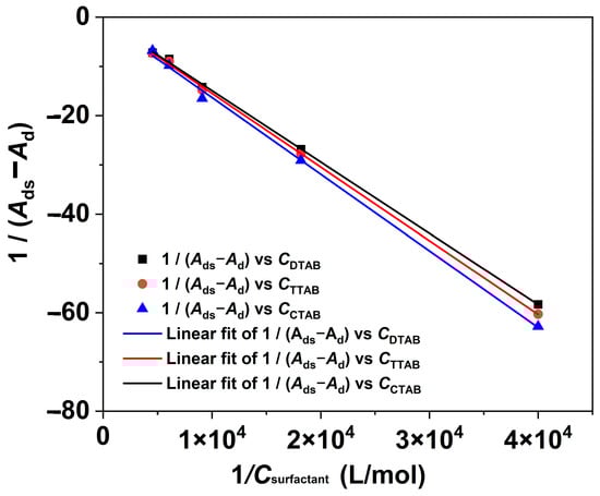 Based on the above analysis, the Benesi–Hildebrand equation, as described in Equation (1) [39], was further used to calculate the binding constants (kb) for the interactions between RBB KN-R and the DTAB, TTAB, and CTAB surfactants.