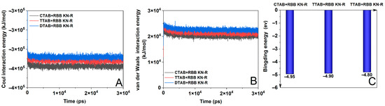 Coulomb interaction energy (A), van der Waals interaction energy (B), and binding energy (C) for RBB KN-R-DTAB, RBB KN-R-TTAB, and RBB KN-R-CTAB systems.