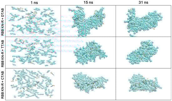 Images of MD trajectories of RBB KN-R-DTAB, RBB KN-R-TTAB, and RBB KN-R-CTAB systems at 1, 15, and 30 ns.