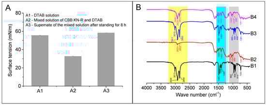 In this section, a comparative assessment of the surface tension of the RBB KN-R (0.22 mmol/L)–DTAB (0.88 mmol/L) solution before and after the precipitation was first undertaken. Then, scrutiny of the FTIR spectra corresponding to the precipitates and the physically combined mixture of DTAB and RBB KN-R, upheld at a 1:1 molar ratio, was conducted. This was conducted in order to give a more comprehensive analysis of the process governing the formation of these precipitates. A detailed exposition of these findings is provided in Figure 9A,B, respectively. Figure 9A shows that the addition of RBB KN-R to the DTAB solution caused a significant decrease in surface tension, which was attributed to the interaction between the dye and surfactant. It is noteworthy that the surface tension of the supernatant improved and was slightly higher than that of the DTAB solution after RBB KN-R was removed. These results suggest that only a small number of DTAB molecules participated in the insoluble aggregation of RBB KN-R. Furthermore, we used the method for measuring the CTAB concentration reported by Kumar et al. [46] to detect the DTAB concentration in the supernatant. Then, the molar ratio of RBB KN-R vs. DTAB in the precipitate was calculated as 1: 0.14 (±0.01), corresponding to a DTAB mass ratio of 7.5 ± 0.5%.