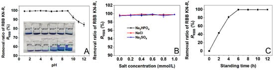 Effects of pH (A), salt type and concentration (B), and standing time (C) on the removal ratio of RBB KN-R.