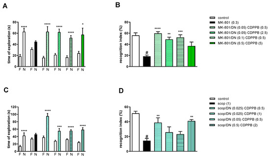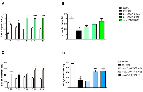 The effect of CDPPB (A,B) or LY487379 (C,D) on preventing scopolamine-induced cognitive impairment in novel object recognition test. Total time spent on exploring the familiar (F) or novel object (N) during the retention trial (A,C). Statistical analysis: (A) * p < 0.05 and **** p < 0.0001 vs. appropriate F times and (C) * p < 0.05 and **** p < 0.0001 vs. appropriate F times. Recognition index: (B) # p < 0.001 vs. control, * p < 0.02 and *** p < 0.0008 vs. scopolamine-treated group and (D) # p < 0.0001 vs. control, *** p < 0.0008 and **** p < 0.0001vs. scopolamine-treated group. Data are presented as the mean ± SEM. Doses in mg/kg are indicated in parentheses.