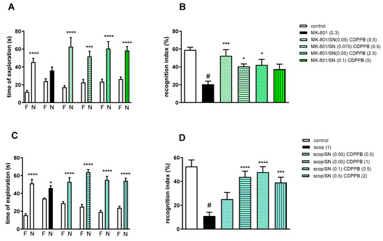 The effect of combined administration of spermineNONOate (SN) and CDPPB on preventing MK-801- (A,B) and scopolamine- (C,D) induced cognitive impairment in novel object recognition test. Total time spent on exploring the familiar (F) or novel object (N) during the retention trial (A,C) and recognition index (B,D). Statistical analysis (A) *** p < 0.0002 and **** p < 0.0001 vs. appropriate F times and (C) * p < 0.05 and **** p < 0.0001 vs. appropriate F times. Recognition index: (B) # p < 0.0001 vs. control, at least * p < 0.03 and *** p < 0.0006 vs. scopolamine-treated group and (D) # p < 0.0001 vs. control, *** p < 0.0005 and **** p < 0.0001 vs. scopolamine-treated group. Data are presented as the mean ± SEM. Doses in mg/kg are indicated in parentheses.