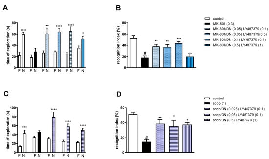 The effect of combined administration of DETANONOate (DN) and LY487379 on preventing MK-801- (A,B) and scopolamine- (C,D) induced cognitive impairment in novel object recognition test. Total time spent on exploring the familiar (F) or novel object (N) during the retention trial (A,C) and recognition index (B,D). Statistical analysis: (A) * p < 0.01, ** p < 0.001 and **** p < 0.0001 vs. appropriate F times and (C) *** p < 0.0004 and **** p < 0.0001 vs. appropriate F times. Recognition index: (B) # p < 0.0001 vs. control, at least ** p < 0.006 and *** p < 0.0002 vs. scopolamine-treated group and (D) # p < 0.0001 vs. control, at least * p < 0.02 and ** p < 0.008 vs. scopolamine-treated group. Data are presented as the mean ± SEM. Doses in mg/kg are indicated in parentheses.